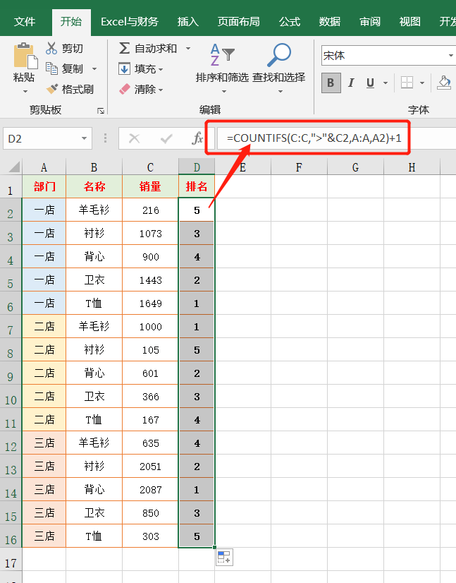 这个公式相对 SUMPRODUCT 函数好理解一些,也就是统计 A 列中 A1 单元格内容的数量和 C 列中大于 C2 单元格内容的数量,满足这两个条件统计的数量再 + 1 就是各部门的排名。