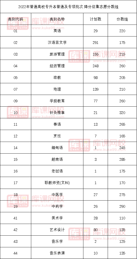 2022 年云南普通专升本第二次征集志愿降分录取分数线