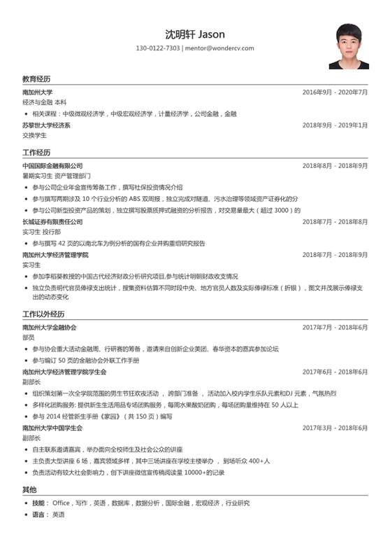 三、重点突出:不但要体现在排版上,也要体现在文字上。所有经历应该按照时间顺序排列,这是简历的通用规范,因为最近的经历对招聘方来说是最重要的。一定注意,不要把你觉得更好更相关的经历跳着放在前面,放心 HR 对相关经验比你更敏感,一眼就能看到。跳着放只会增加混乱感。